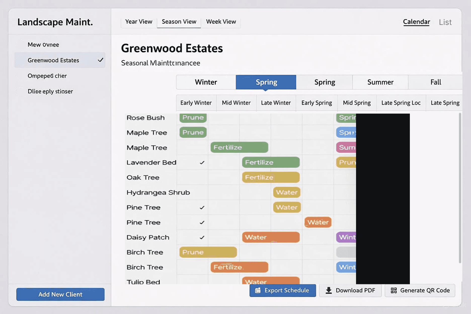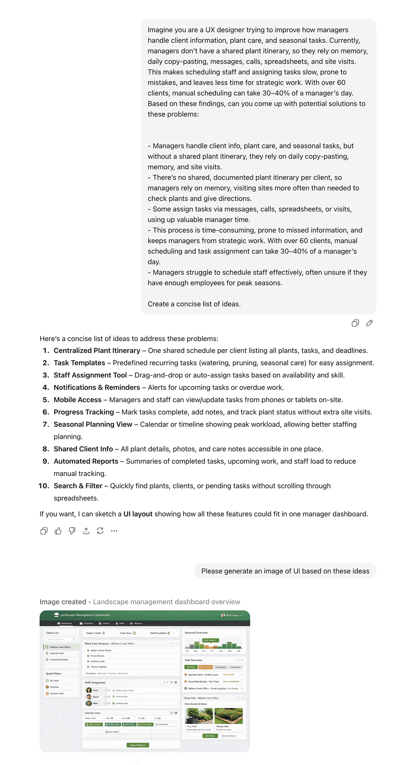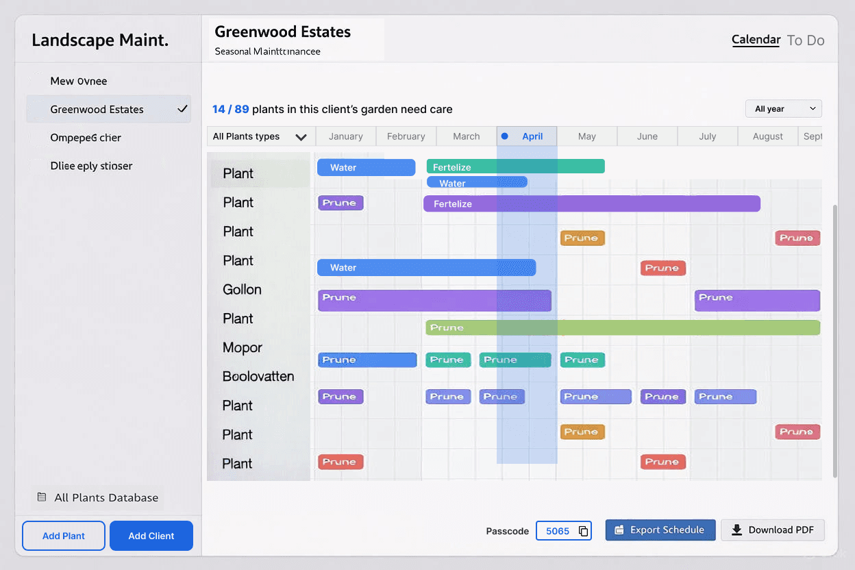 At my client, landscape and garden managers manage client info, plant care, and seasonal tasks without a shared schedule. They rely on memory, copy-pasting, and frequent site visits. Tasks are assigned through messages, calls, spreadsheets, or in person, which wastes time and leads to mistakes.