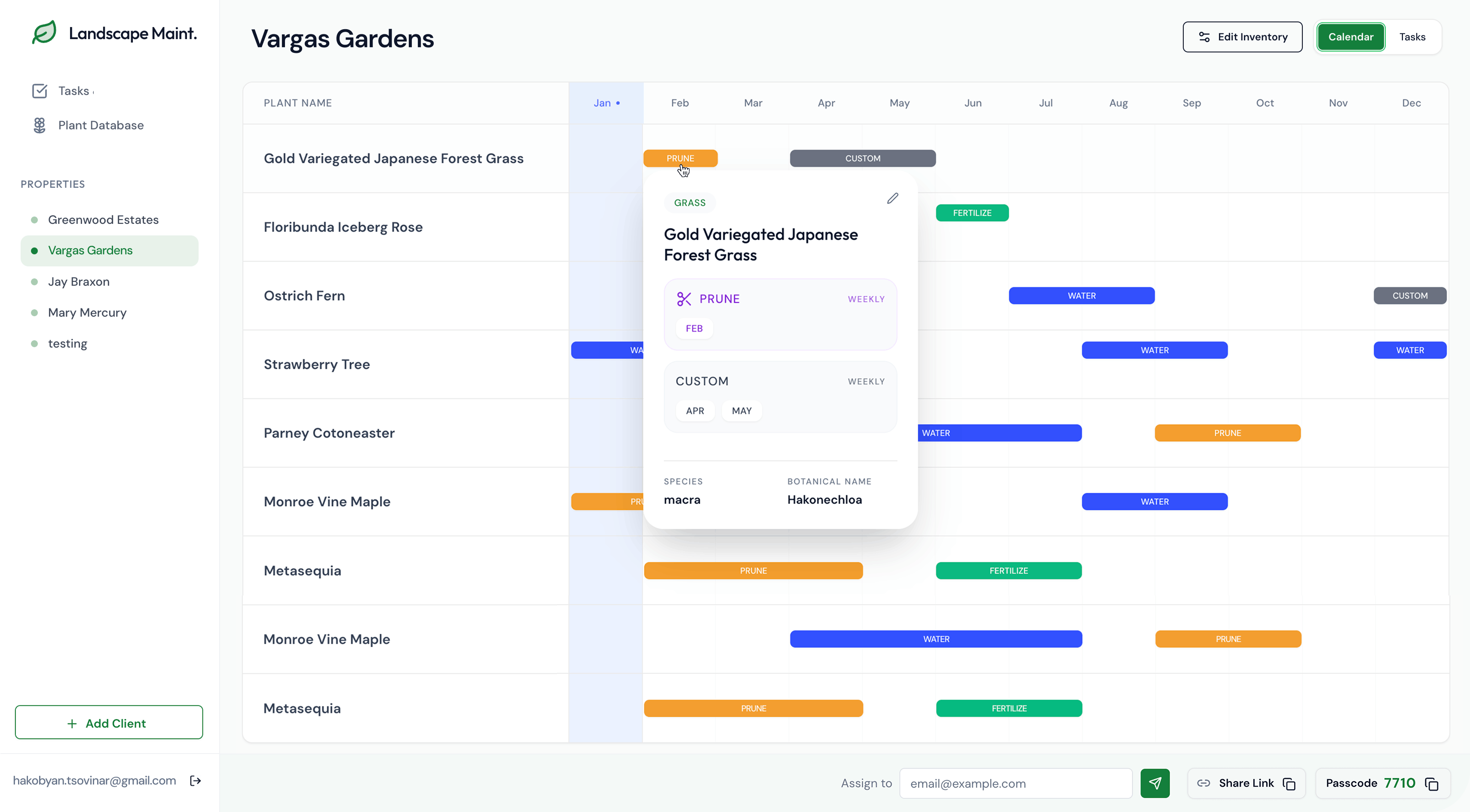 Tasks: High-level view of the monthly plant care list across all clients. This is the first page managers see when they log in.