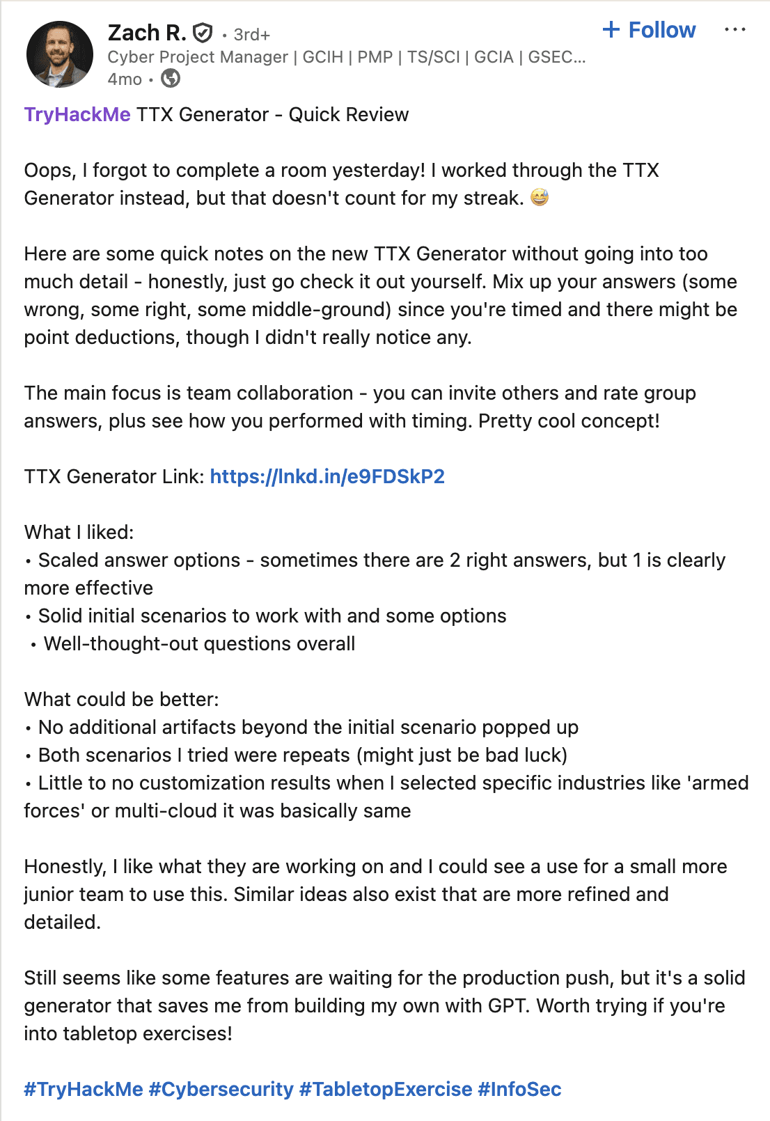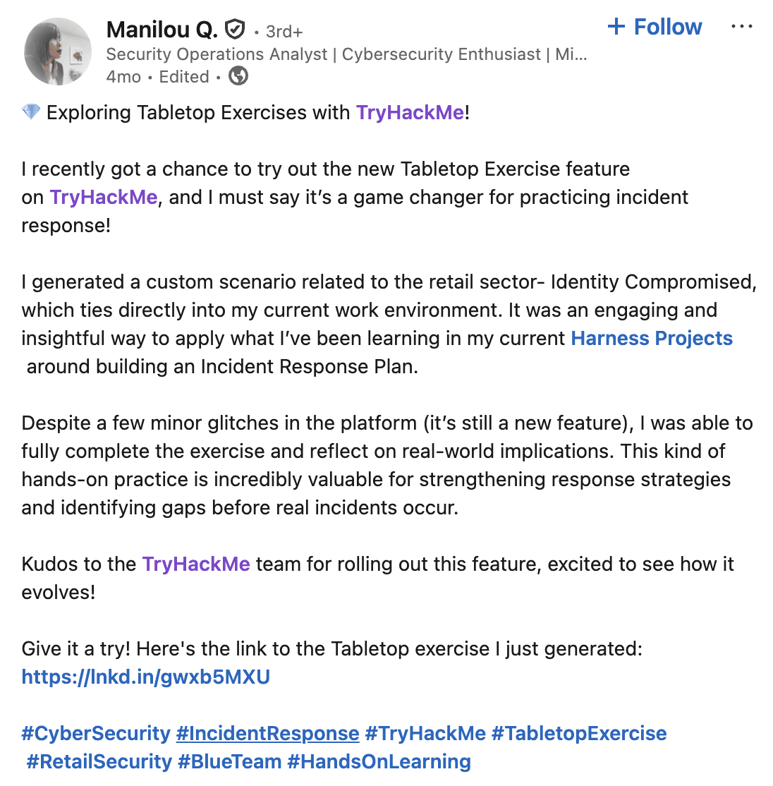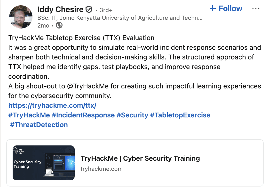 TryHackMe is a leading online cybersecurity training platform, used by individuals, academic institutions, and corporate security teams. Over 6 million users and 1,000+ enterprise teams rely on it, some of whom I got to interview for insights on TTX challenges.