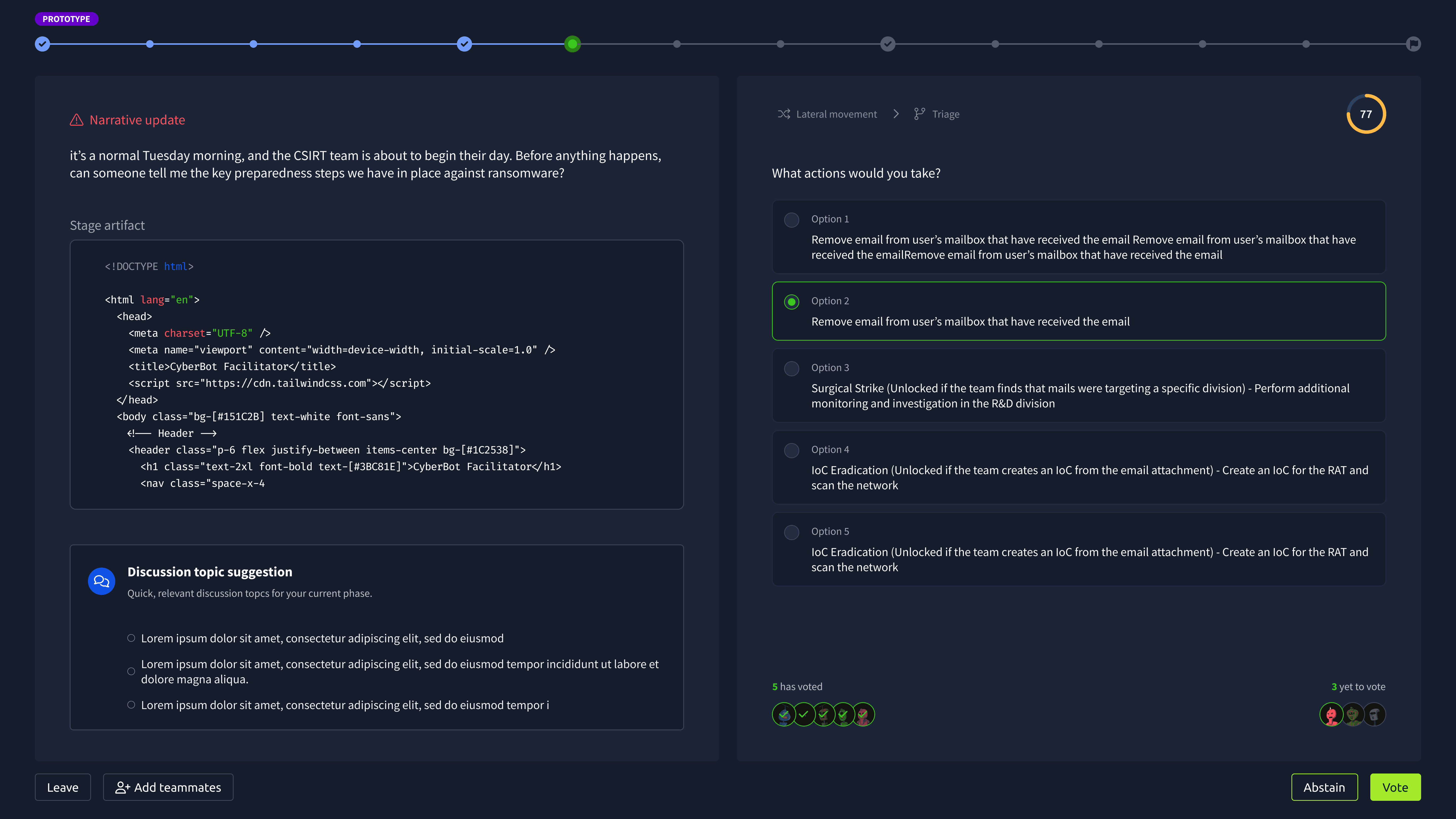 Exercise Page: Users track their progress, pick answers, view participants, and check who has voted. The left side shows the evolving narrative with artifacts.