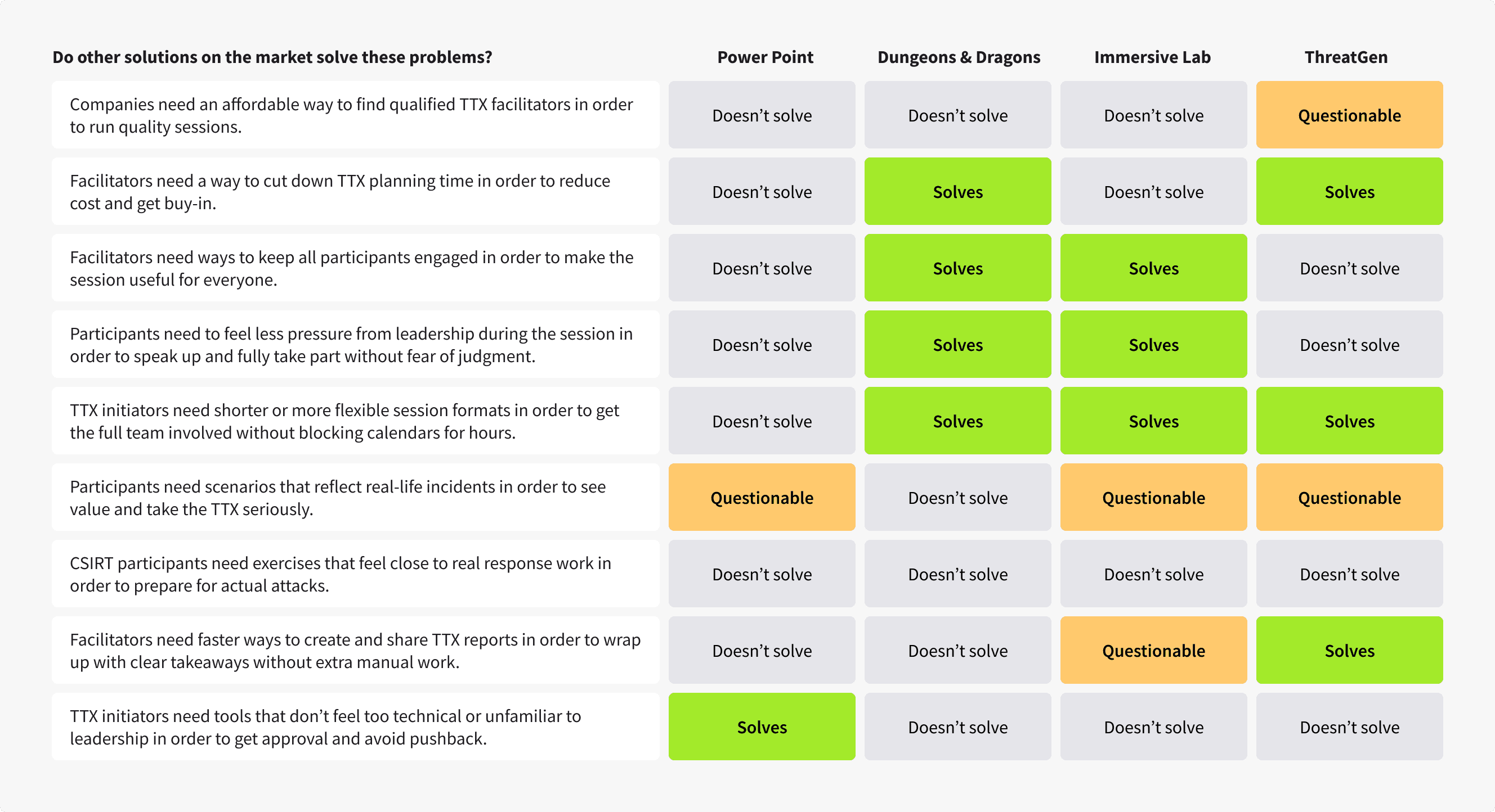 Recruiting TTX users or facilitators was tough, there just aren’t that many companies running TTXs, which is part of the problem we’re trying to solve. Luckily, our customer success team was amazing. They helped us bring in participants, including some tech giants.