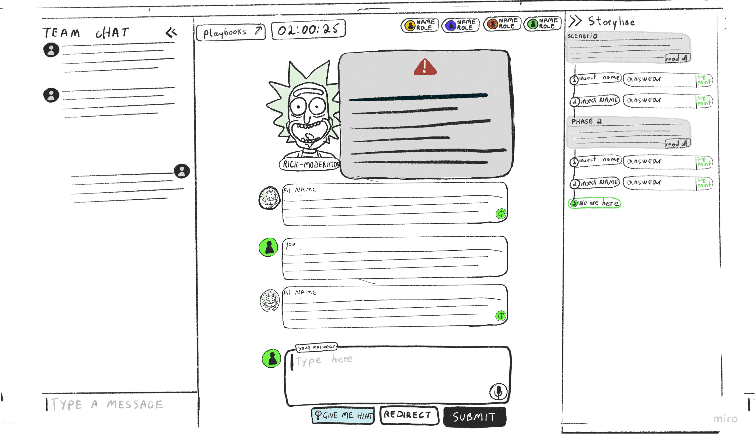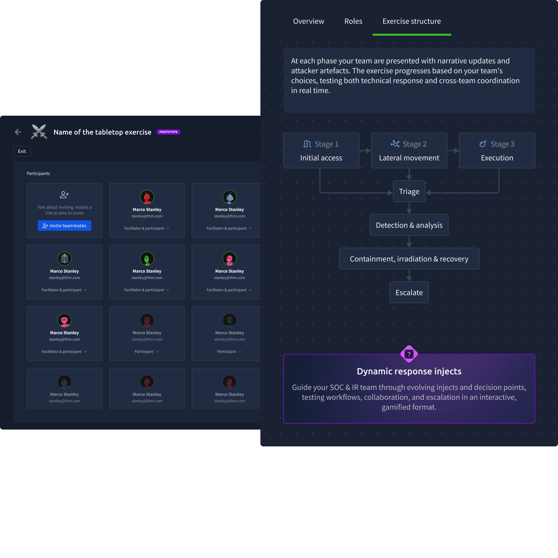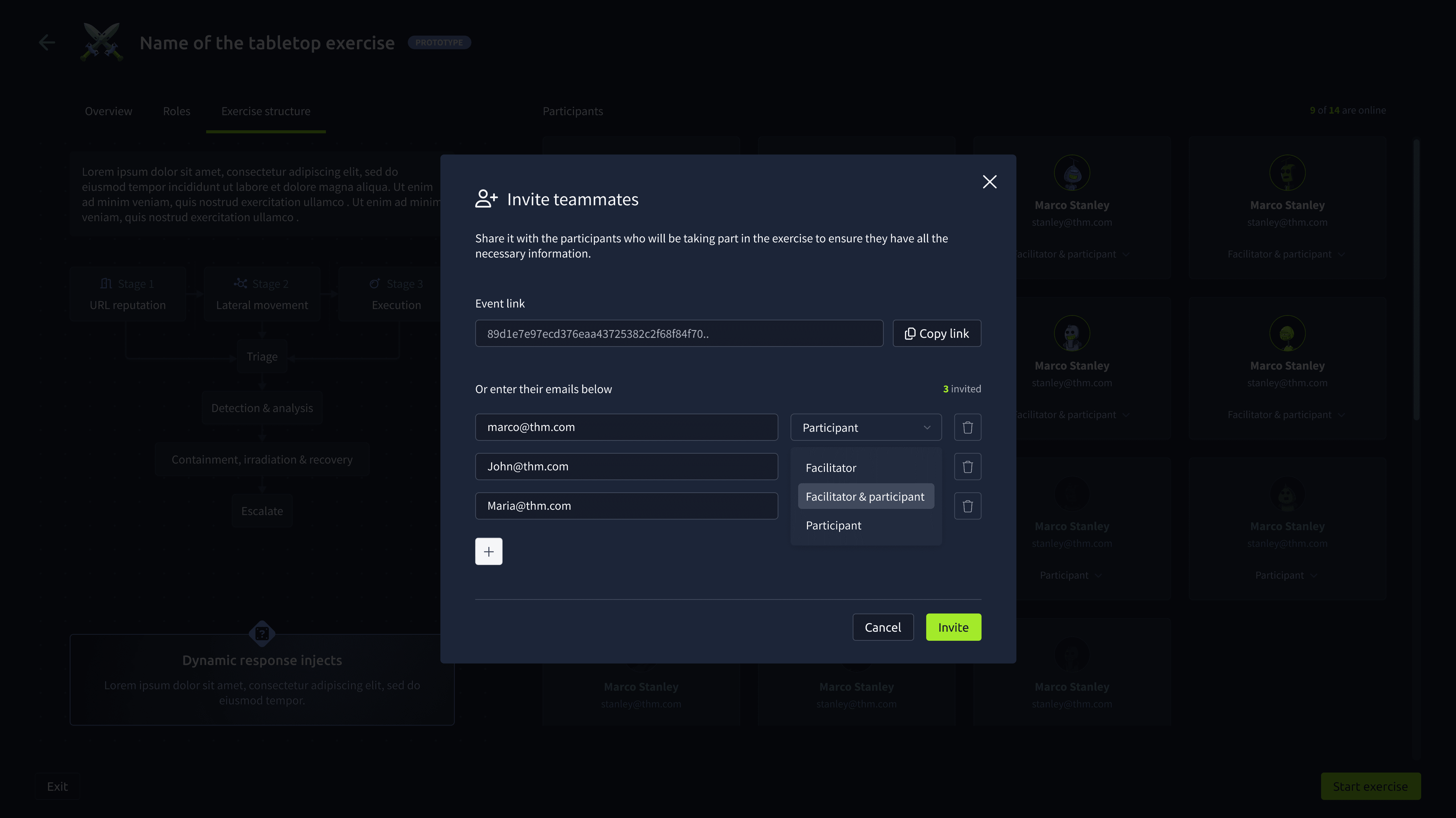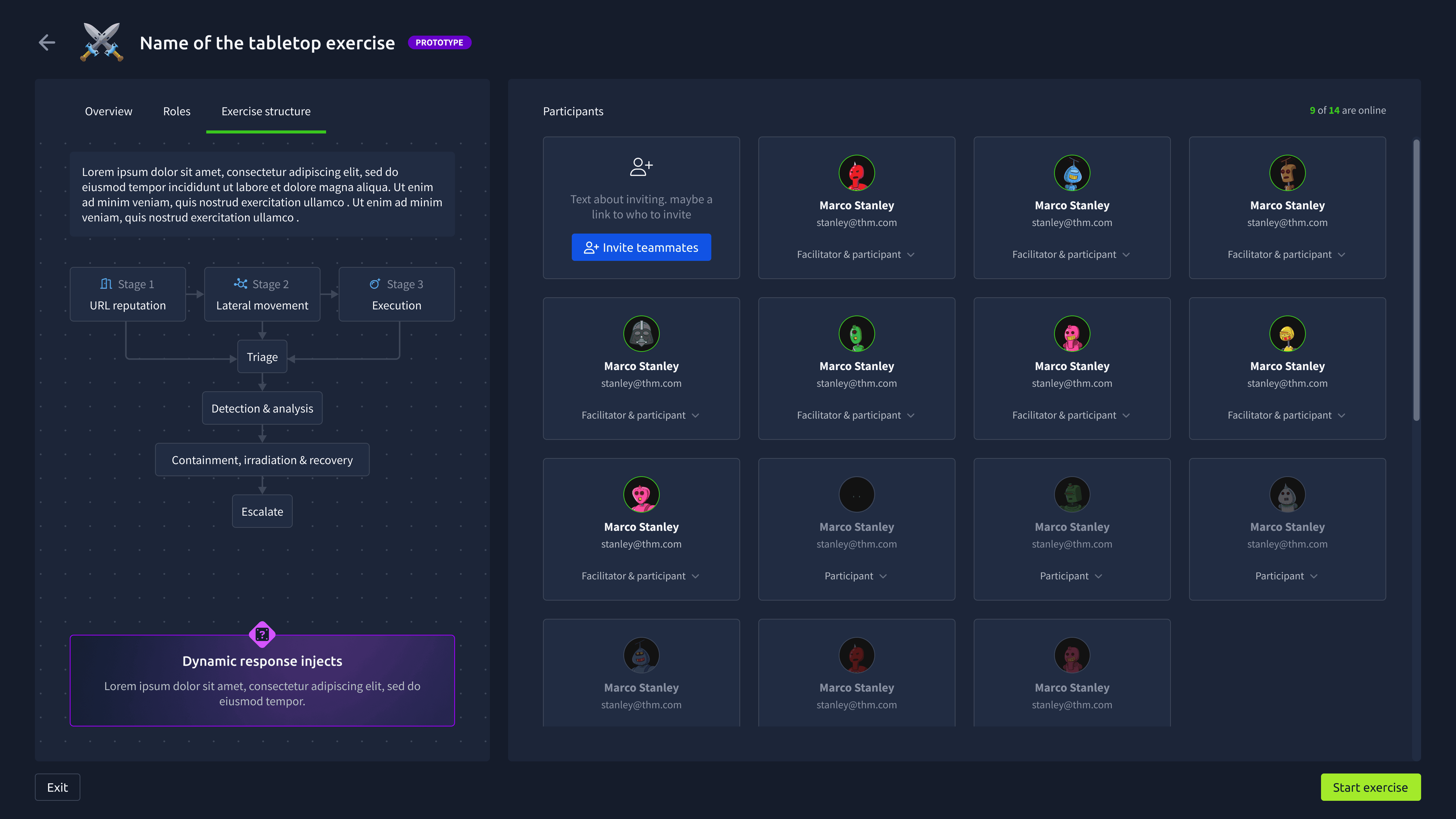 Lobby Page: Participants can review the scenario, roles, and structure of the exercise. They can also invite others and assign roles.